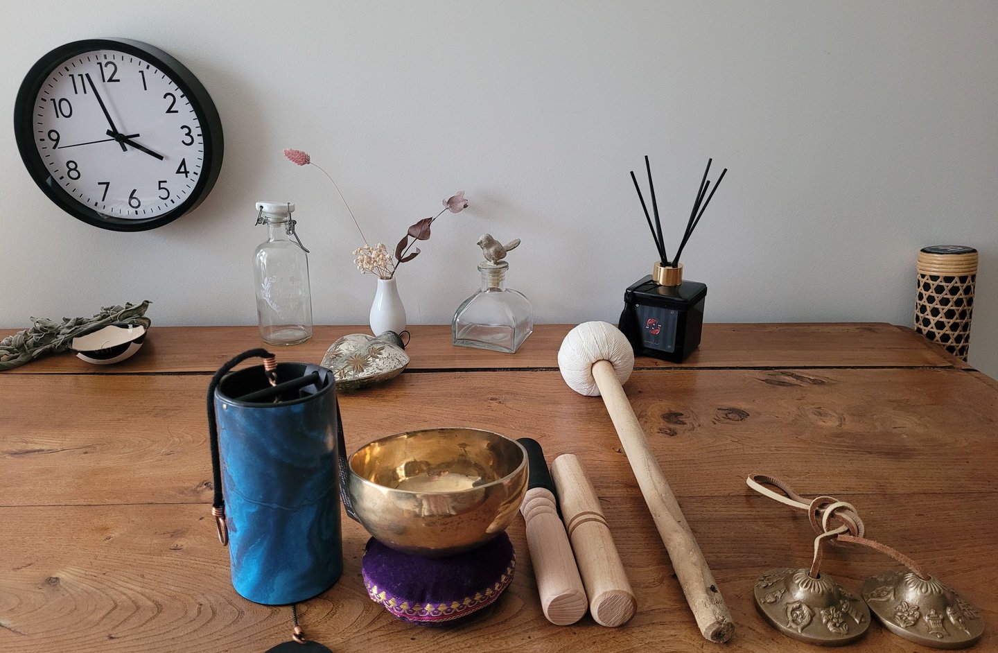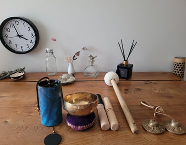 Dans un second temps — ou simultanément selon les besoins — j'intègre la sonothérapie. Les vibrations émises par les bols tibétains, le bol en cristal, le gong, les diapasons et le carillon pénètrent le corps en profondeur et amplifient le travail de rééquilibrage déjà amorcé par le magnétisme.